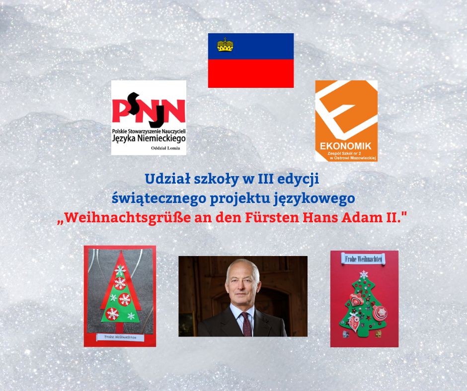 Nauczyciele języka niemieckiego należący do Stowarzyszenia Nauczycieli Języka Niemieckiego oddział Łomża wraz ze swoimi uczniami wzięli udział w III edycji projektu językowego „Weihnachtsgrüße an den Fürsten Hans Adam II.”. W ramach tego projektu uczniowie szkół podstawowych i ponadpodstawowych przygotowali własnoręcznie wykonane kartki świąteczne wraz z życzeniami z okazji