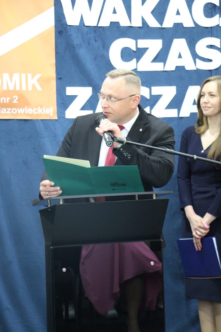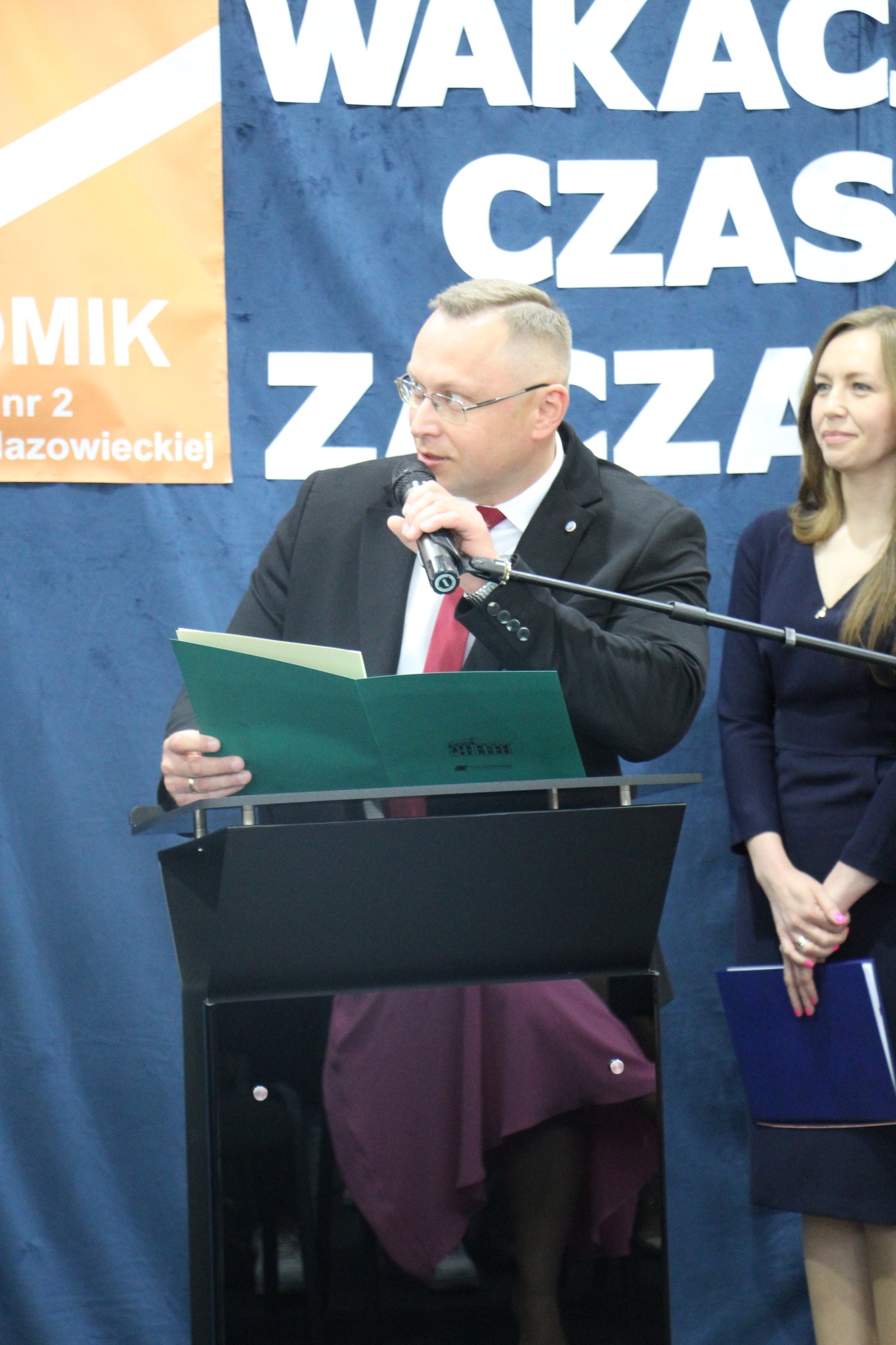 Na początku uroczystości Dyrektor Zespołu Szkół nr 2 – Pan Bogusław Konrad – serdecznie przywitał zaproszonych gości, wśród których znaleźli się: Sekretarz Powiatu Ostrowskiego – Pani Ewa Suchcicka, Dyrektor Regionalnego Banku Spółdzielczego w Ostrowi Mazowieckiej – Pan Marcin Płotczyk oraz Nadleśniczy Nadleśnictwa Ostrów Mazowiecka – Pan Waldemar Wańczyk. Z wielką życzliwością Pan Dyrektor przywitał również rodziców, którzy przybyli na tę uroczystość oraz nauczycieli, wychowawców, pracowników administracji i obsługi,