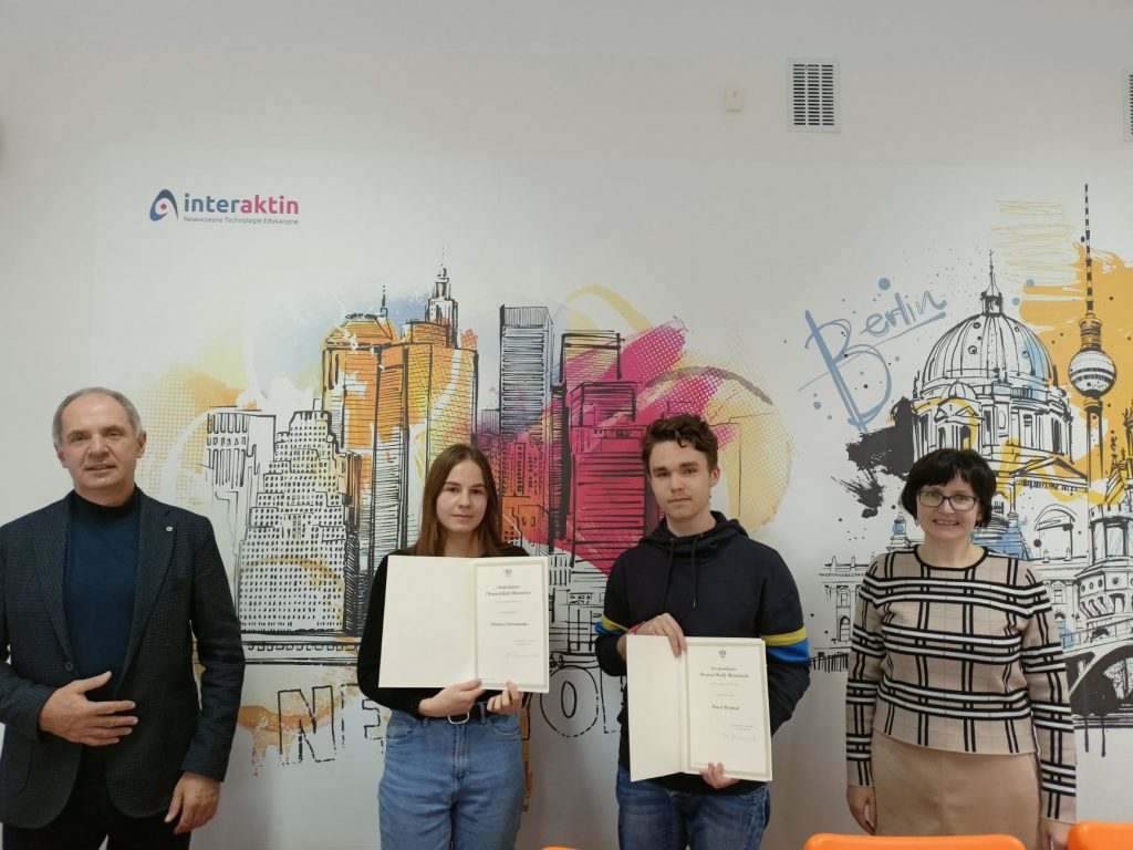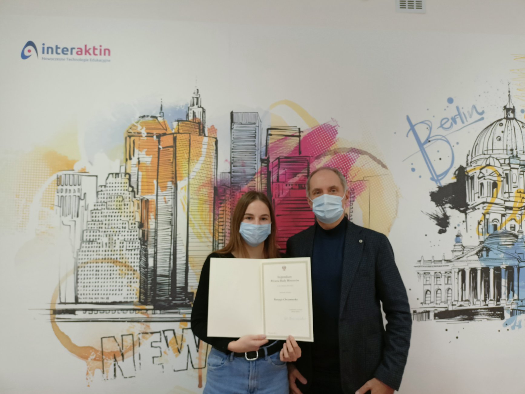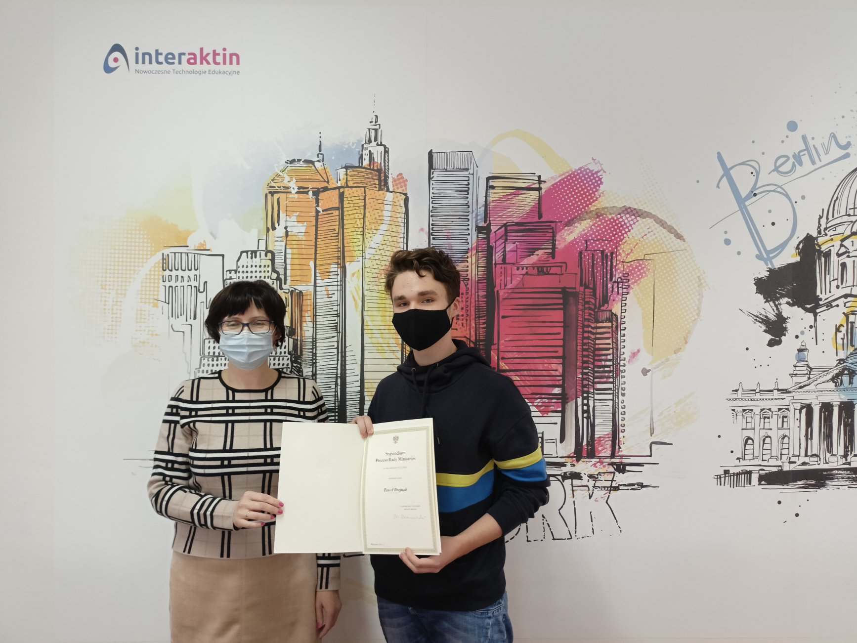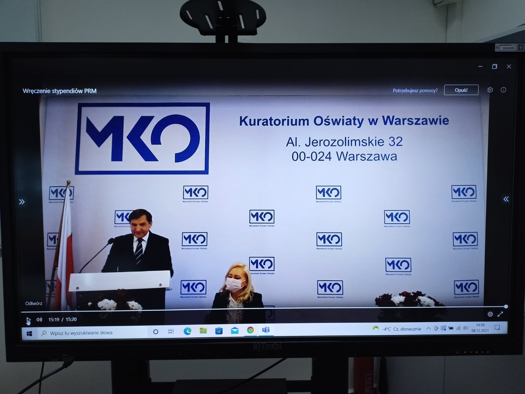 W dniu 08.12.2021 odbyło się uroczyste wręczenie stypendiów Prezesa Rady Ministrów Mateusza Morawieckiego. Ze względu na panującą sytuacje pandemiczną uroczystość odbyła się zdalnie. Laureaci naszej szkoły wraz z dyrekcją obejrzeli wideokonferencje, podczas której Pani Aurelia Michałowska – Mazowiecki Kurator Oświaty w imieniu premiera złożyła serdeczne gratulacje nagrodzonym, życząc jednocześnie „by sięgali gwiazd”. Serdecznie gratulujemy naszym tegorocznym laureatom: