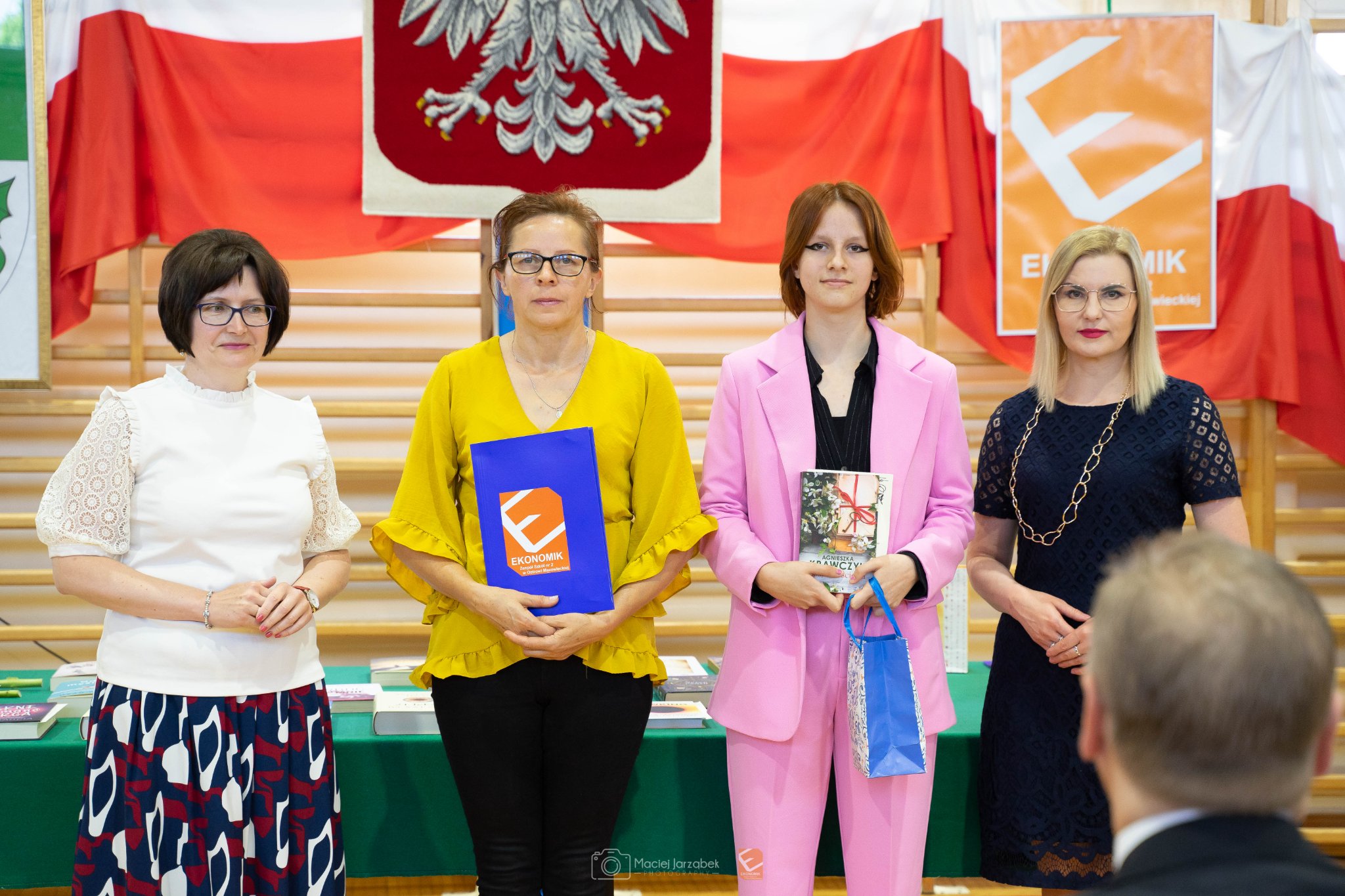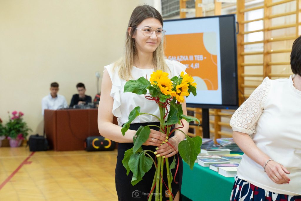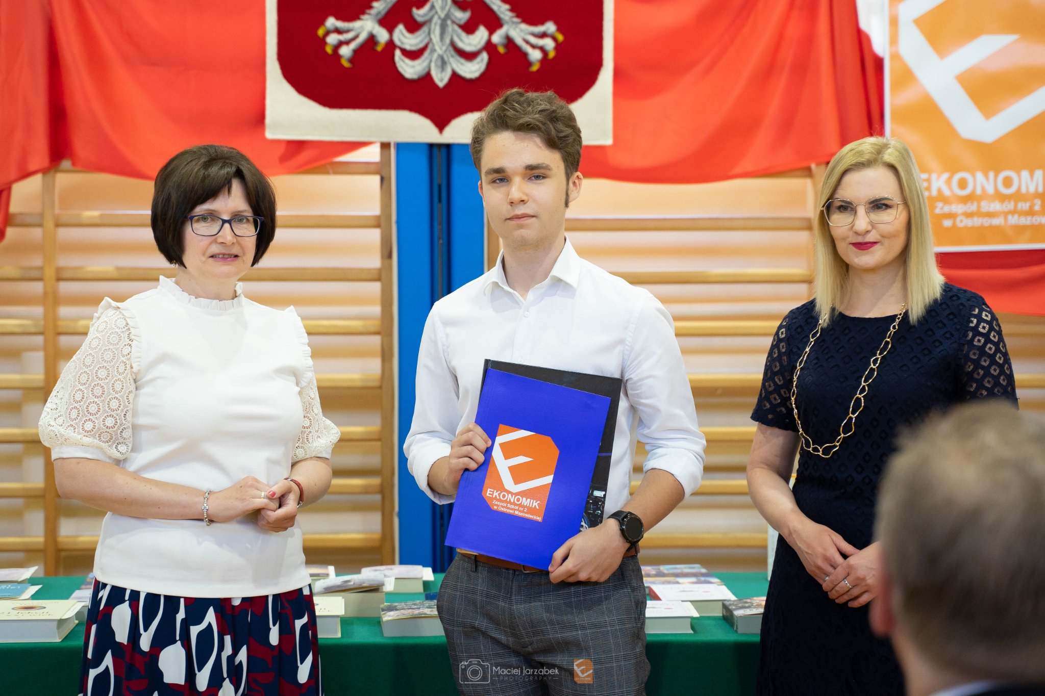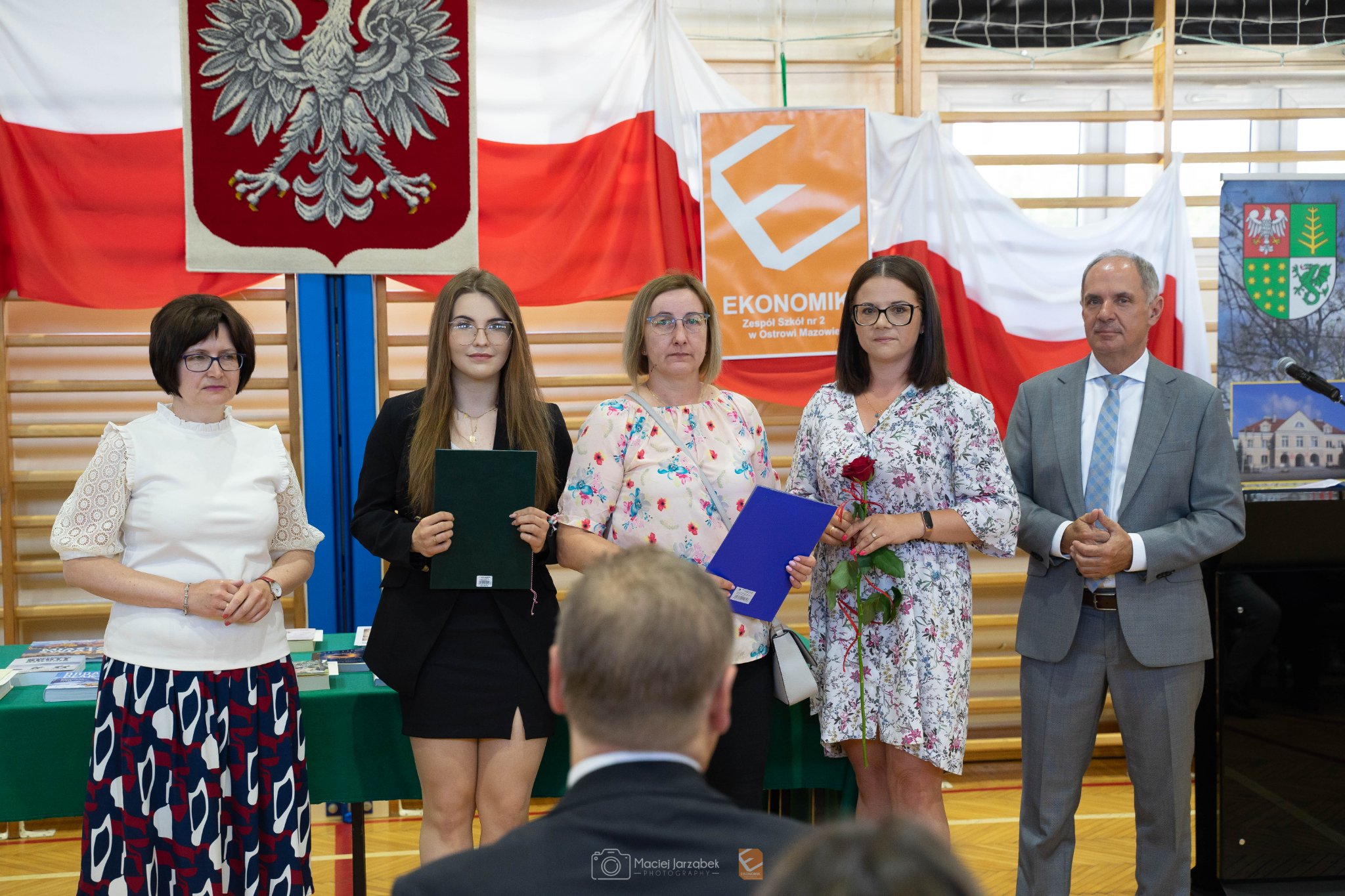 Punktualnie o godzinie 9.15 rozpoczęło się uroczyste zakończenie roku szkolnego. Pan Dyrektor Bogusław Konrad przywitał uczniów, rodziców, nauczycieli, pracowników szkoły oraz zaproszonych gości: Panią Dorotę Subdę – Przewodniczącą Rady Powiatu Ostrowskiego, Pana Dariusza Kołodziejskiego- Wiceprezesa Zarządu Banku Spółdzielczego w Ostrowi Mazowieckiej, Panią Katarzynę Dajnowicz reprezentującą Stowarzyszenie Przewoźników Ostrów Mazowiecka, Pana Adama Lubczyńskiego – przedstawiciela Muzeum – Dom Rodziny Pileckich w Ostrowi Mazowieckiej, Pana ppłk. Roberta Grodzińskiego- Zastępcę Dowódcy 22 Wojskowego Ośrodka Kartograficznego w Komorowie oraz Pana Roberta Pawlaka-Zastępcę Przewodniczącej Rady Rodziców. W czasie uroczystości uczniowie odebrali nagrody książkowe za wzorowe zachowanie, bardzo dobre wyniki w nauce, stuprocentową frekwencję oraz za osiągnięcia sportowe i konkursy przedmiotowe. Uczniowie z najwyższą średnią zostali wytypowani do stypendium Prezesa Rady Ministrów: z II Liceum Ogólnokształcącego Kinga Gajewska ze średnią ocen 5,15, a z Technikum nr 2 Paweł Brejnak ze średnią ocen 5,10. Najlepszy ekonomista Kinga Gałązka z klasy III TEB i spedytor – Paulina Gąsecka z klasy II TSH otrzymały nagrody pieniężne ufundowane przez Bank Spółdzielczy w Ostrowi Mazowieckiej oraz Stowarzyszenie Przewoźników Ostrów Mazowiecka. Wręczono również listy gratulacyjne rodzicom uczniów z najwyższą średnią w szkole. Takie podziękowanie otrzymali również rodzice Macieja Dąbrowskiego, który reprezentował szkołę na ogólnopolskich konkursach plastycznych o tematyce historycznej, zajmując wysokie miejsca na podium.