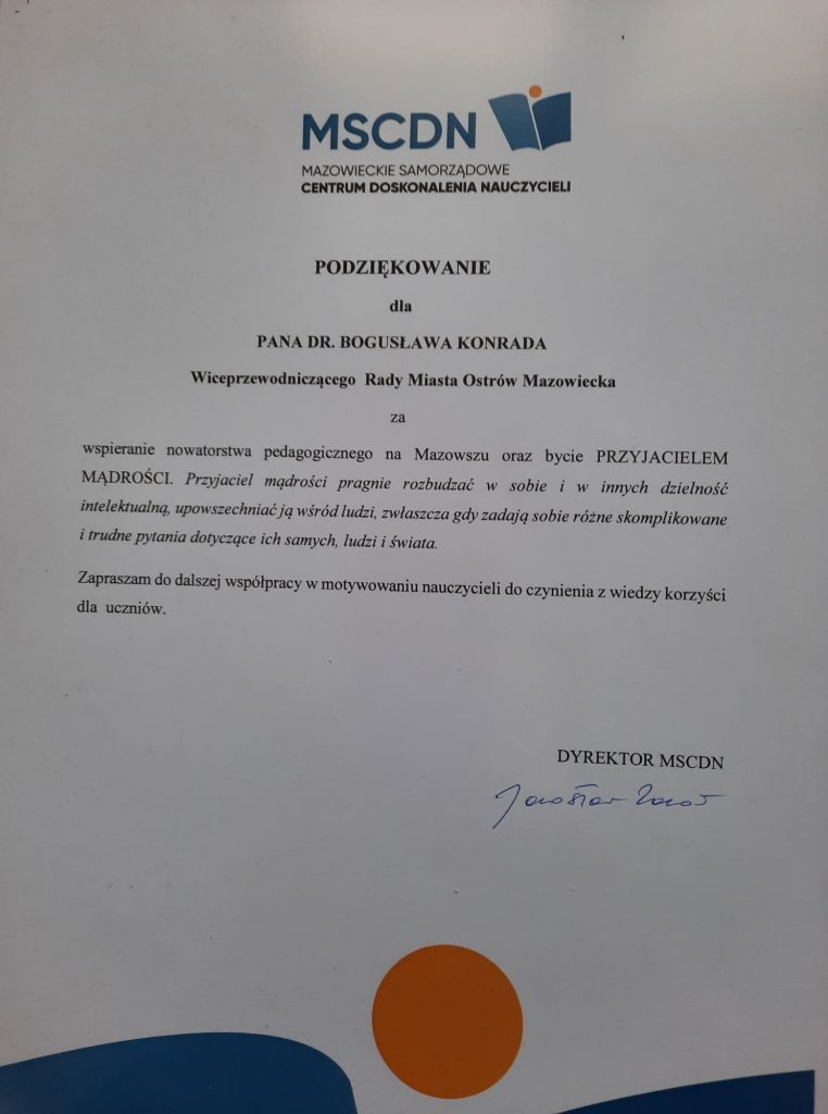 W dniu 17 listopada br., na Zamku Biskupów Płockich w Pułtusku odbyło się Czwarte Międzynarodowe Forum Nowatorstwa Pedagogicznego, pod Honorowym Patronatem Mazowieckiego Kuratora Oświaty. Udział w konferencji wziął dyrektor szkoły p. Bogusław Konrad, pedagog szkolny p. Ewelina Majewska oraz nauczycielka historii p. Urszula Zadroga. Celem Forum jest przedstawienie dobrych praktyk innowacji i eksperymentów pedagogicznych, zainspirowanie nauczycieli do podejmowania nowatorskich działań dydaktycznych i wychowawczych min. poprzez sięganie do dziedzictwa cywilizacyjnego Europy.