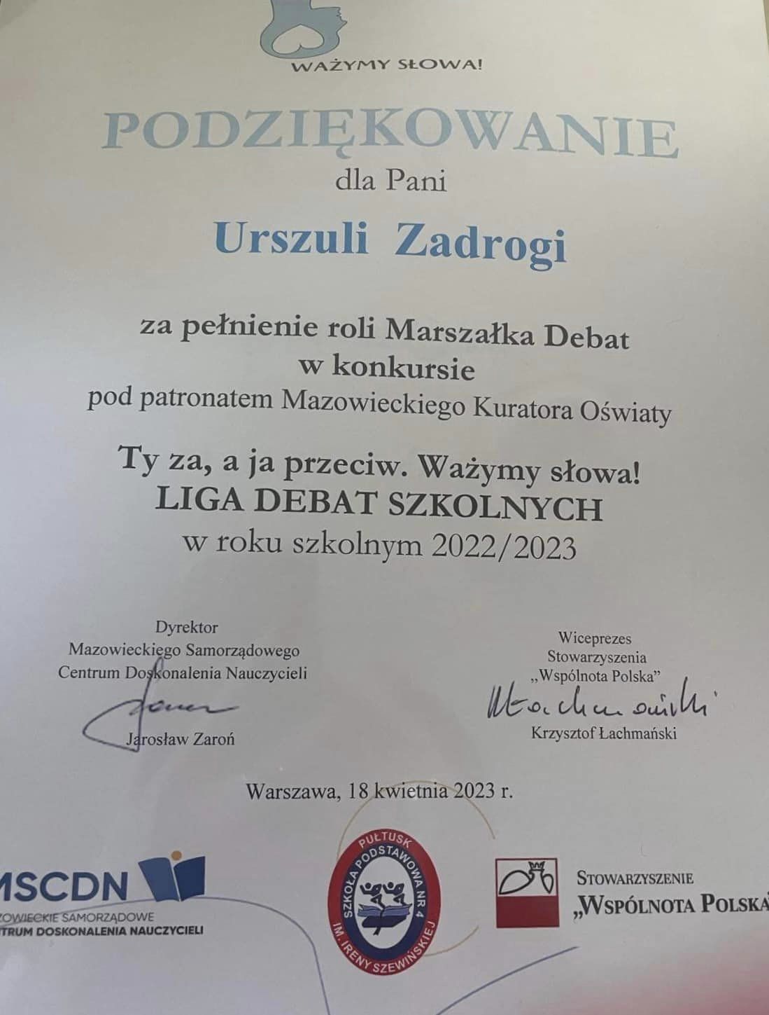 18 kwietnia br. na Zamku Biskupów Płockich w Pułtusku odbyła się pod patronatem Mazowieckiego Kuratora Oświaty trzecia, finałowa Liga Debat Szkolnych 2022/2023: Ty za, a ja przeciw. Ważymy słowa!
