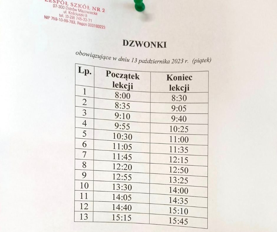 Dzwonki obowiązujące w dniu 13.10.2023 r. / Wiadomości ze szkoły / By Dominik Szuliński Uwaga! Powyżej znajdują się dzwonki obowiązujące w dniu 13.10.2023 r. (piątek)