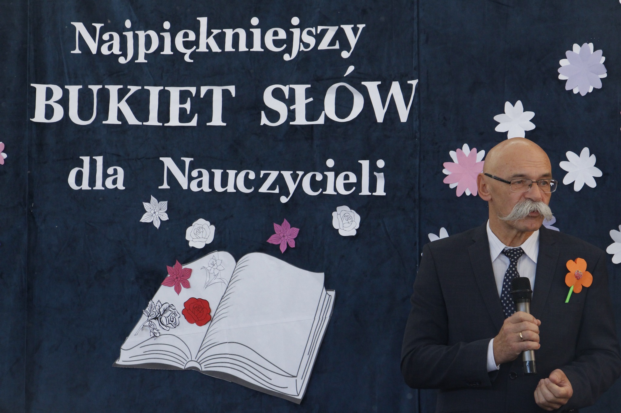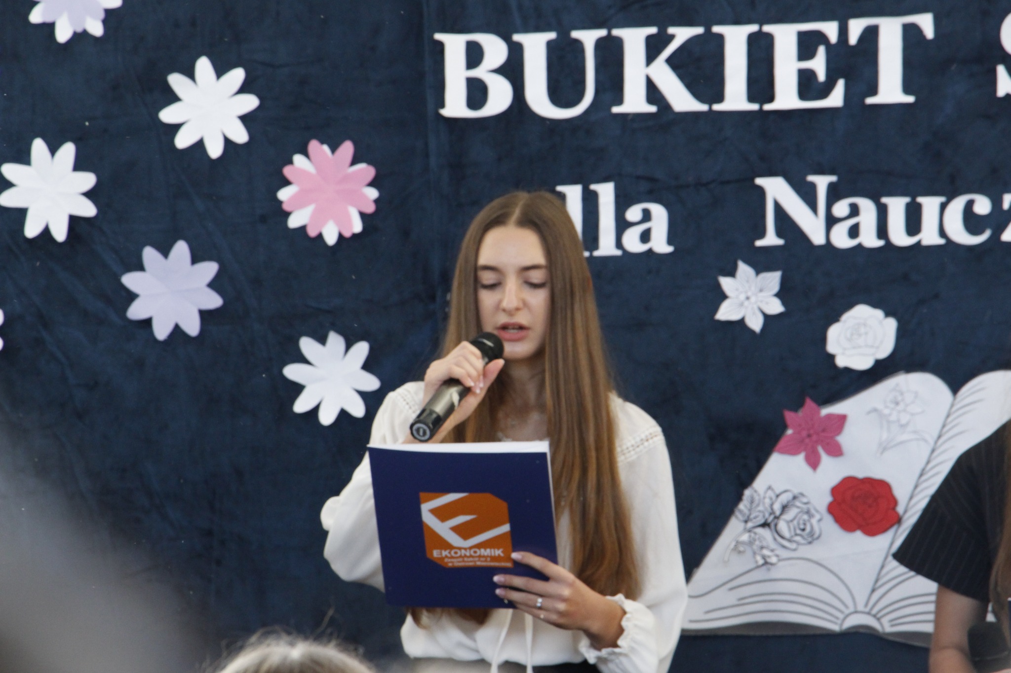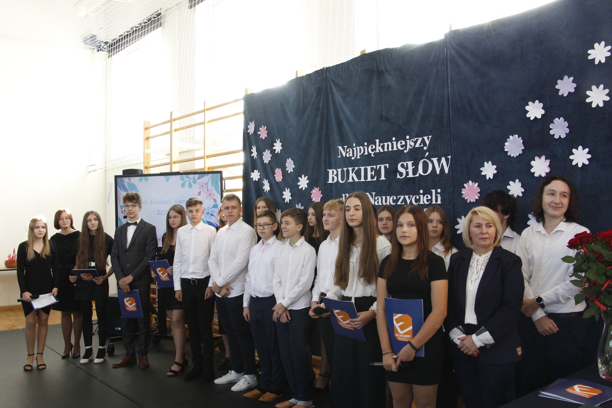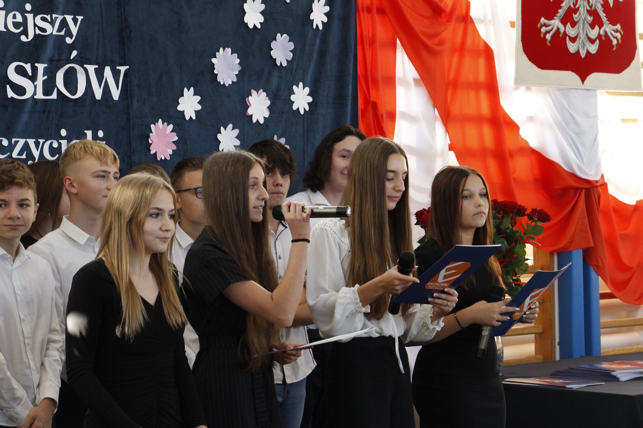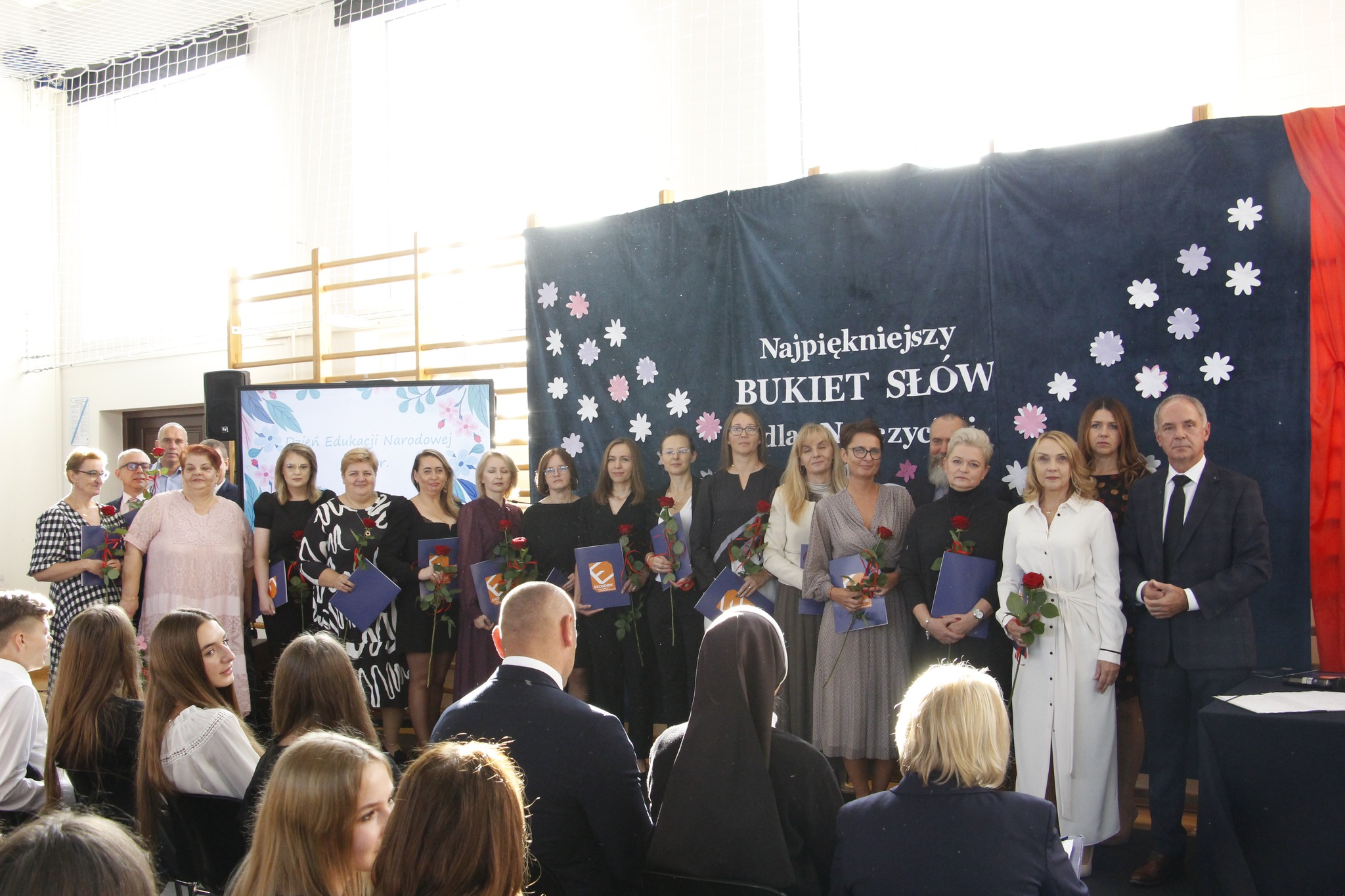 Po części artystycznej głos zabrał Pan Dyrektor Bogusław Konrad, który przypomniał, że Dzień Edukacji Narodowej to święto wszystkich zaangażowanych w edukację – nie tylko nauczycieli, ale też pracowników administracji i obsługi oraz uczniów. Pan Dyrektor podziękował całej społeczności szkolnej: nauczycielom za codzienną pracę dydaktyczną, wychowawczą i opiekuńczą – „To ważne, że podczas pracy kształtują Państwo postawy moralne i obywatelskie młodych ludzi. Dziękuję za wrażliwe na potrzeby uczniów serca, za odpowiedzialność, sprawiedliwość i konsekwencję w realizacji zadań”, pracownikom administracji i obsługi – „za codzienną, rzetelną, sumienną pracę”, uczniom „za odpowiedzialne i inspirujące postawy, za promowanie naszej szkoły, za młodzieńczy entuzjazm, dociekliwość i wszystkie pomysły związane z rozwojem szkoły”. Pan Dyrektor poinformował również wszystkich zebranych o wyjątkowym wyróżnieniu dla Pani Wicedyrektor Małgorzaty Grzeszczuk, która otrzymała Nagrodę Ministra Edukacji i Nauki. Przedstawił także nauczycieli, którym zostały przyznane Nagrody Zarządu Powiatu – w tym roku nagrody otrzymali Pani Małgorzata Sikora oraz Pan Krzysztof Wiśniewski – oraz wręczył Nagrody Dyrektora nauczycielom i pracownikom szkoły. Nagrody Dyrektora Szkoły w roku szkolnym 2023/2024 otrzymali: Pani Anna Błażyńska, Pan Arkadiusz Borawski, Pani Katarzyna Buczyńska, Pan Sławomir Cieśluk, Pani Bożena Grochowska, Pani Monika Krajewska Pani Monika Kucharczyk, Pani Magdalena Kulesza, Pani Izabela Krasińska, Pani Ewelina Majewska, Pan Robert Najmoła, Pan Artur Obuchowski, Pani Jolanta Ponichtera Pani Małgorzata Radwańska, Pani Anna Rozumek, Pani Beata Rutkowska Pani Ewa Rzuczkowska, Pani Dorota Sadowska oraz Pani Urszula Zadroga. Wszystkim nagrodzonym gratulujemy!