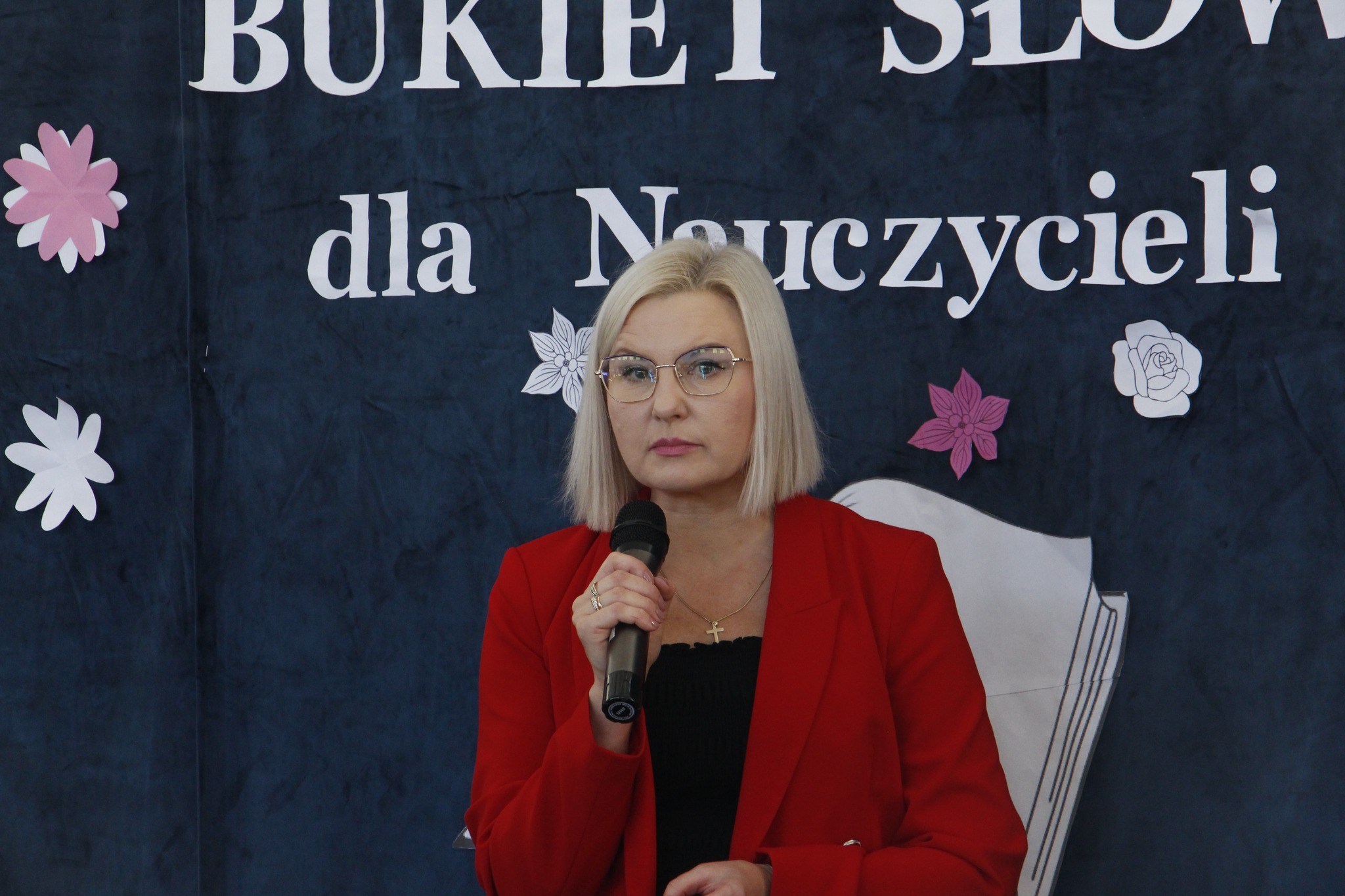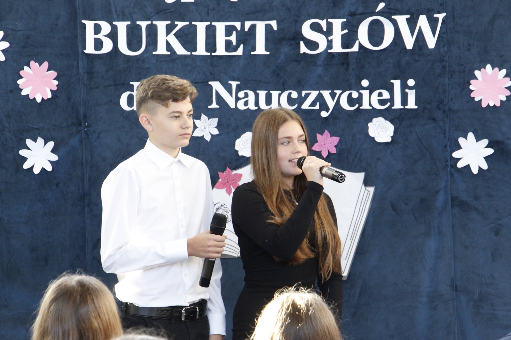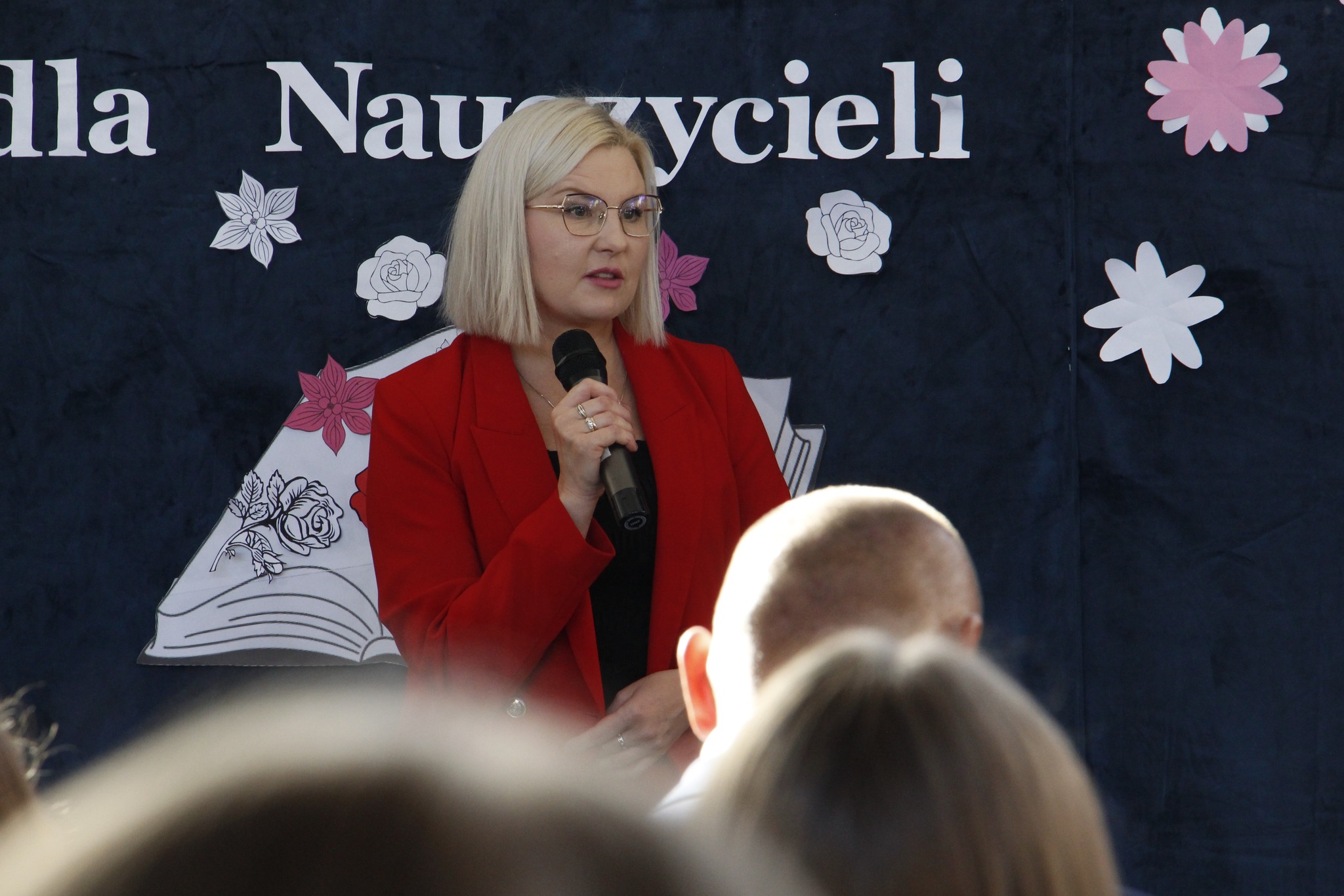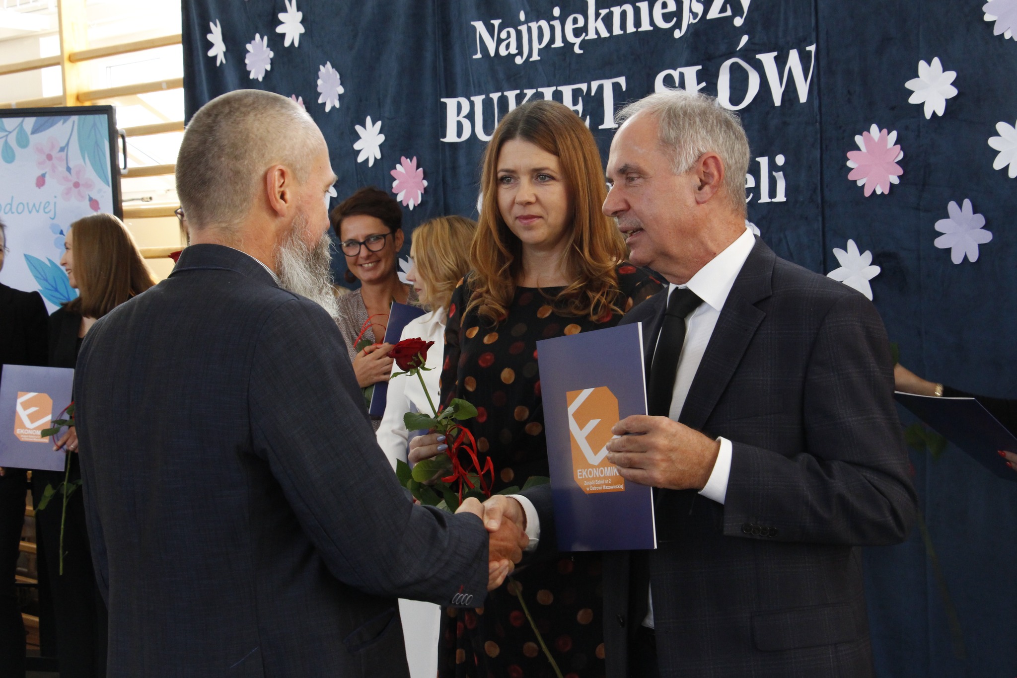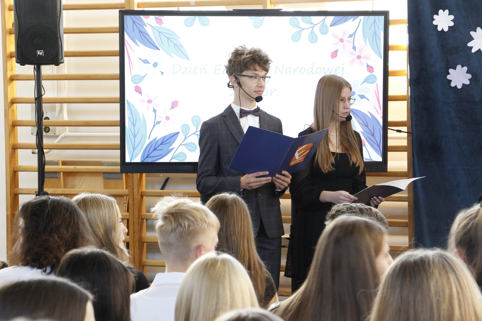 Po części artystycznej głos zabrał Pan Dyrektor Bogusław Konrad, który przypomniał, że Dzień Edukacji Narodowej to święto wszystkich zaangażowanych w edukację – nie tylko nauczycieli, ale też pracowników administracji i obsługi oraz uczniów. Pan Dyrektor podziękował całej społeczności szkolnej: nauczycielom za codzienną pracę dydaktyczną, wychowawczą i opiekuńczą – „To ważne, że podczas pracy kształtują Państwo postawy moralne i obywatelskie młodych ludzi. Dziękuję za wrażliwe na potrzeby uczniów serca, za odpowiedzialność, sprawiedliwość i konsekwencję w realizacji zadań”, pracownikom administracji i obsługi – „za codzienną, rzetelną, sumienną pracę”, uczniom „za odpowiedzialne i inspirujące postawy, za promowanie naszej szkoły, za młodzieńczy entuzjazm, dociekliwość i wszystkie pomysły związane z rozwojem szkoły”. Pan Dyrektor poinformował również wszystkich zebranych o wyjątkowym wyróżnieniu dla Pani Wicedyrektor Małgorzaty Grzeszczuk, która otrzymała Nagrodę Ministra Edukacji i Nauki. Przedstawił także nauczycieli, którym zostały przyznane Nagrody Zarządu Powiatu – w tym roku nagrody otrzymali Pani Małgorzata Sikora oraz Pan Krzysztof Wiśniewski – oraz wręczył Nagrody Dyrektora nauczycielom i pracownikom szkoły. Nagrody Dyrektora Szkoły w roku szkolnym 2023/2024 otrzymali: Pani Anna Błażyńska, Pan Arkadiusz Borawski, Pani Katarzyna Buczyńska, Pan Sławomir Cieśluk, Pani Bożena Grochowska, Pani Monika Krajewska Pani Monika Kucharczyk, Pani Magdalena Kulesza, Pani Izabela Krasińska, Pani Ewelina Majewska, Pan Robert Najmoła, Pan Artur Obuchowski, Pani Jolanta Ponichtera Pani Małgorzata Radwańska, Pani Anna Rozumek, Pani Beata Rutkowska Pani Ewa Rzuczkowska, Pani Dorota Sadowska oraz Pani Urszula Zadroga. Wszystkim nagrodzonym gratulujemy!