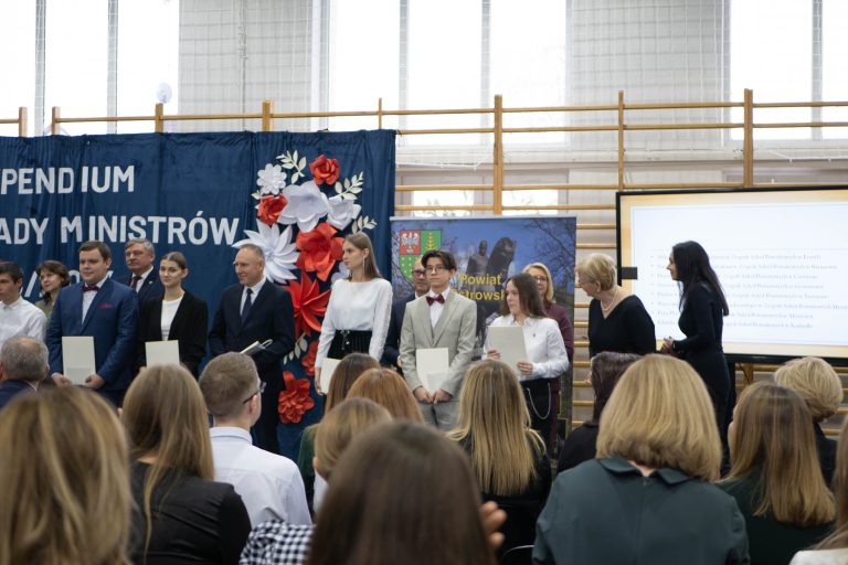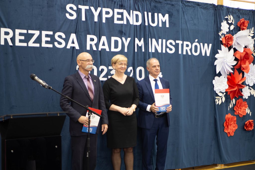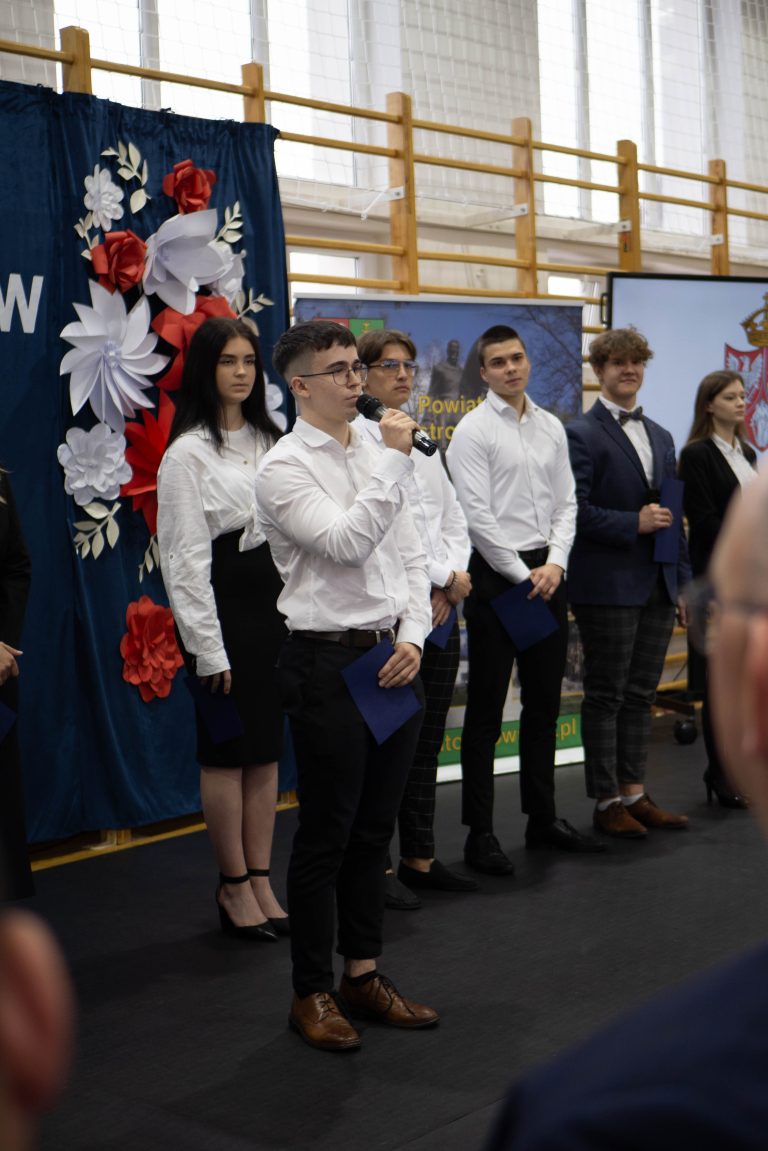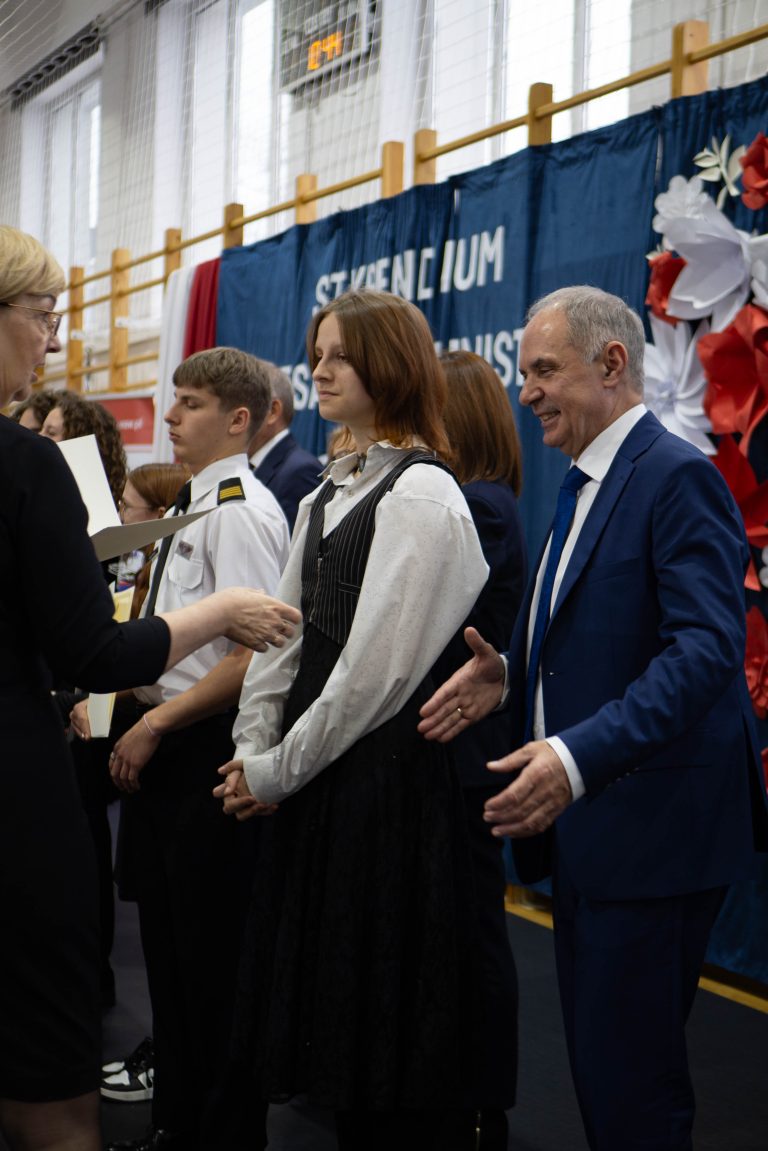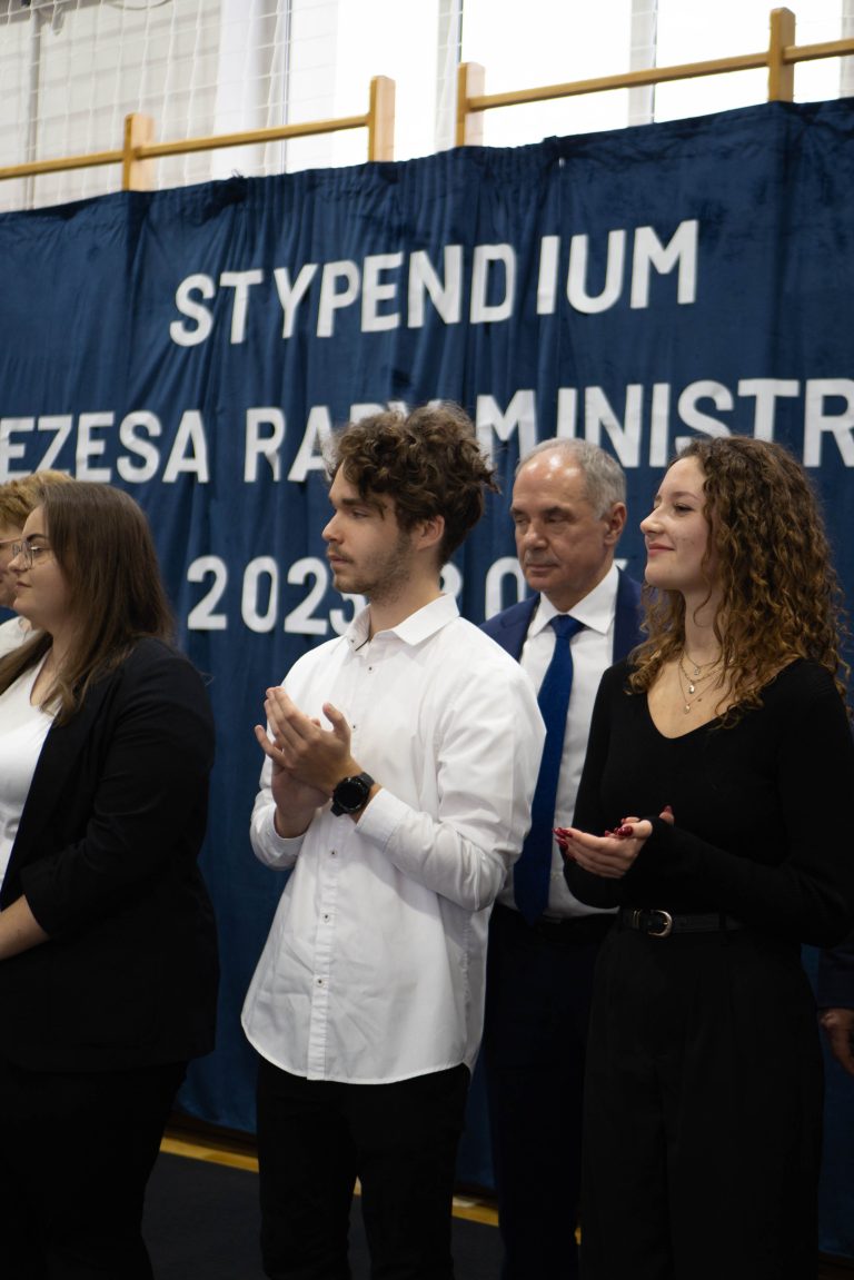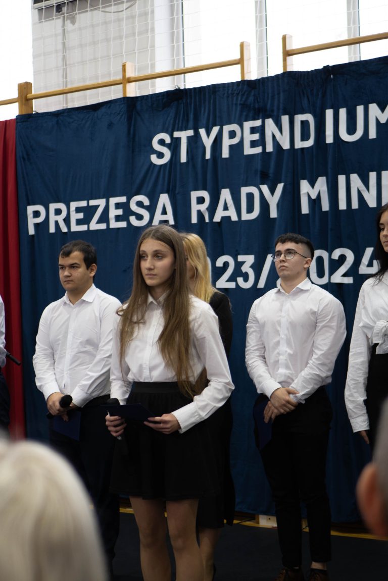 Docenienie wysiłku, jaki młody człowiek wkłada w swój rozwój, jest niezwykle ważne. Mówiła o tym w swoim wystąpieniu uczennica naszej szkoły – Maria Tułowiecka, która zabrała głos w imieniu nagrodzonych uczniów. „Szanowni Państwo, czuję się zaszczyconai wyróżniona, że mogę zabrać głos w imieniu nagrodzonych uczniów. Otrzymanie Stypendium Prezesa Rady Ministrów sprawiło, że czujemy się docenieni i jeszcze bardziej zmotywowani. Takie momenty sprawiają, iż w pełni rozumiemy mądrość zawartąw sentencji: „Per aspera ad astra” – „Przez trudy do gwiazd”. Naprawdę wierzymy, że dzięki ciężkiej pracy, determinacji, ambicjom, ale i chęci poszerzania horyzontów, zdobywania wiedzy, jesteśmy w stanie wiele osiągnąć. W tym miejscu chcieliśmy serdecznie podziękować wszystkim Państwu, którzy przyczyniliście się do naszego sukcesu, a w szczególności: dyrekcji, nauczycielom i rodzicom, za codzienną troskę o stworzenie nam warunków do rozwoju naszych talentów. Dziękujemy wszystkim tym, którzy przyczynili się do tego, że otrzymaliśmy tę nagrodę, gdyż jest ona symbolicznym aktem docenienia nas, naszej pracy. Będzie ona dla nas źródłem motywacji i bodźcem do odblokowania być może jeszcze nie w pełni wykorzystanego potencjału. Powiedziałam, że stypendium jest symbolicznym aktem uznania, jednakże – nie tylko symbolicznym, gdyż otrzymane środki z pewnością będą stanowić wsparcie podczas kontynuowania edukacji. Możemy je przeznaczyć na zakup wymarzonych pomocy naukowych, ułatwiających przyswajanie informacji, na wyposażenie zwiększające efektywność nauki, kursy rozwijające zainteresowania i pasje. Także – na książki. Bo jak to kiedyś pięknie powiedziała Ewa Szelburg – Zarembina: „Książka (…) powinna być – orężem w walce, cegłą w budowie, drogowskazem na bezdrożu, zachętą do pracy i wytchnieniem po trudzie – zwierciadłem prawdy.” I w tym zwierciadle będziemy się przeglądać. Dziękuję.”