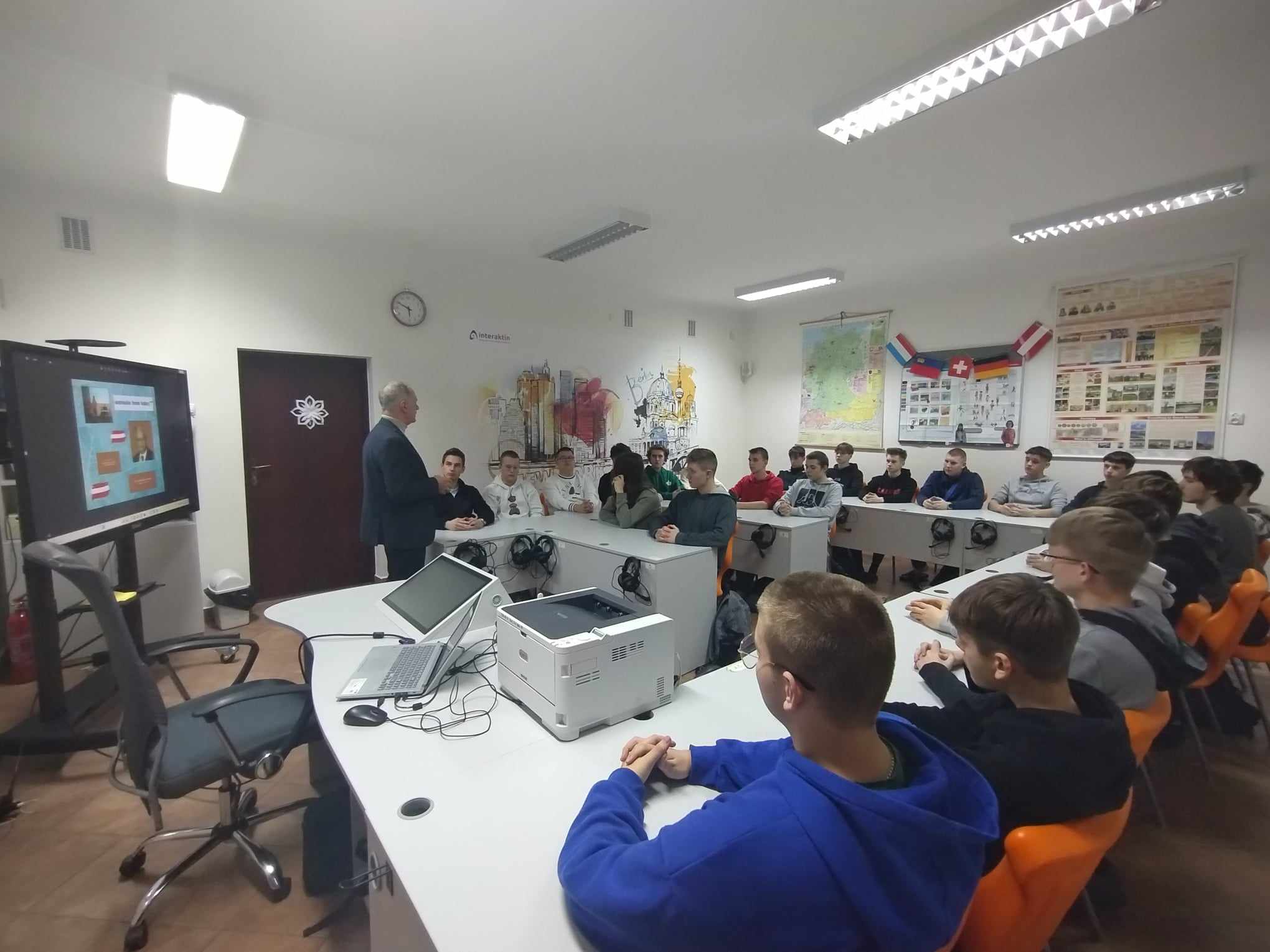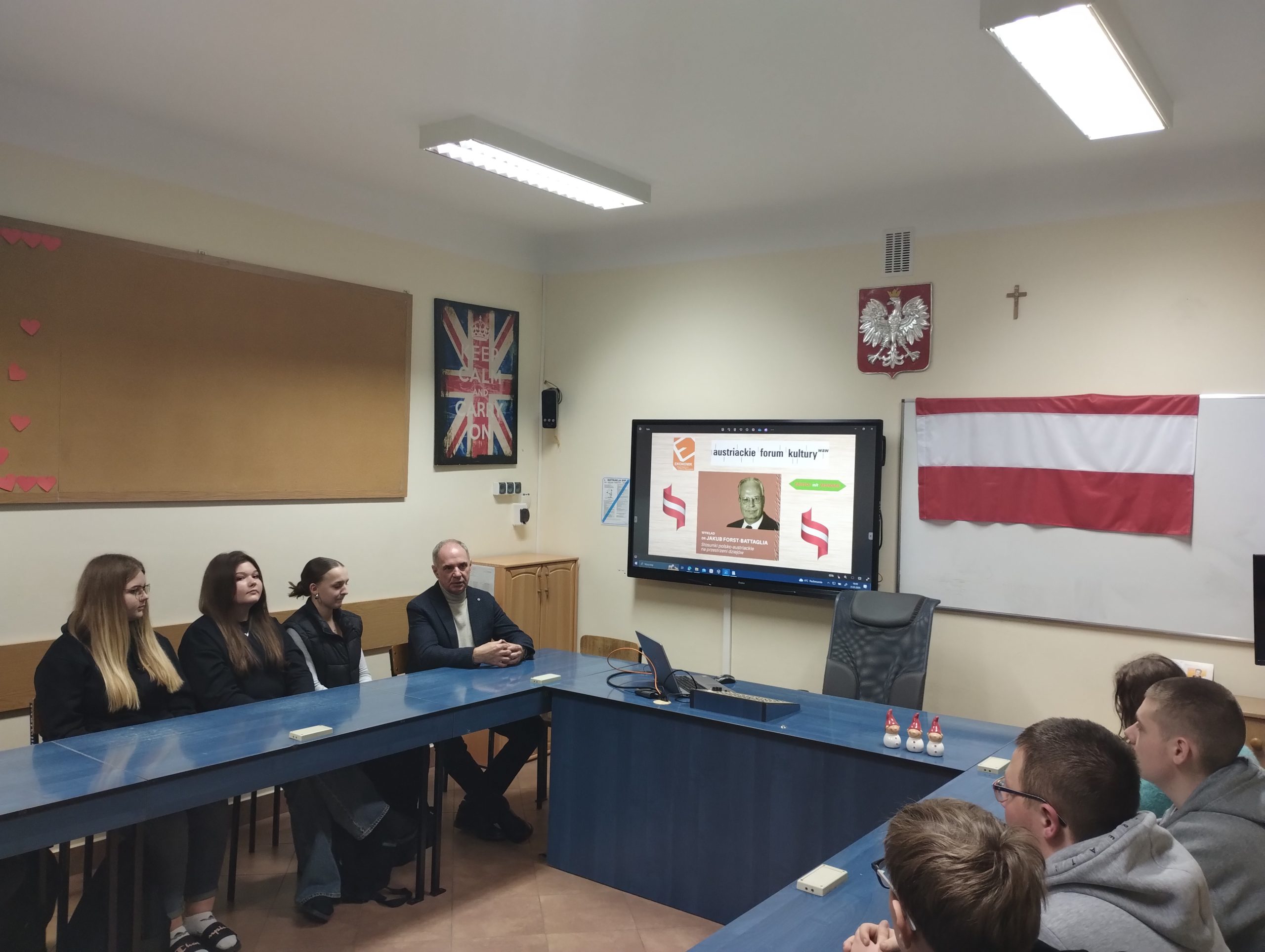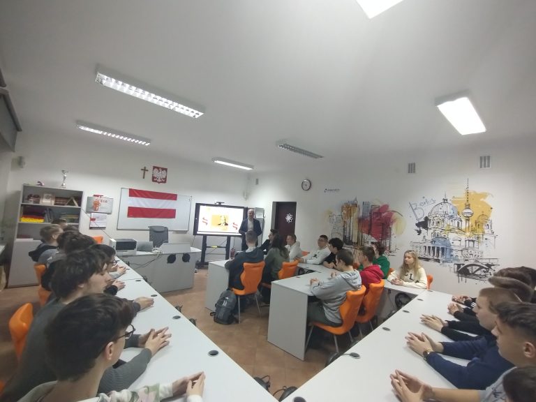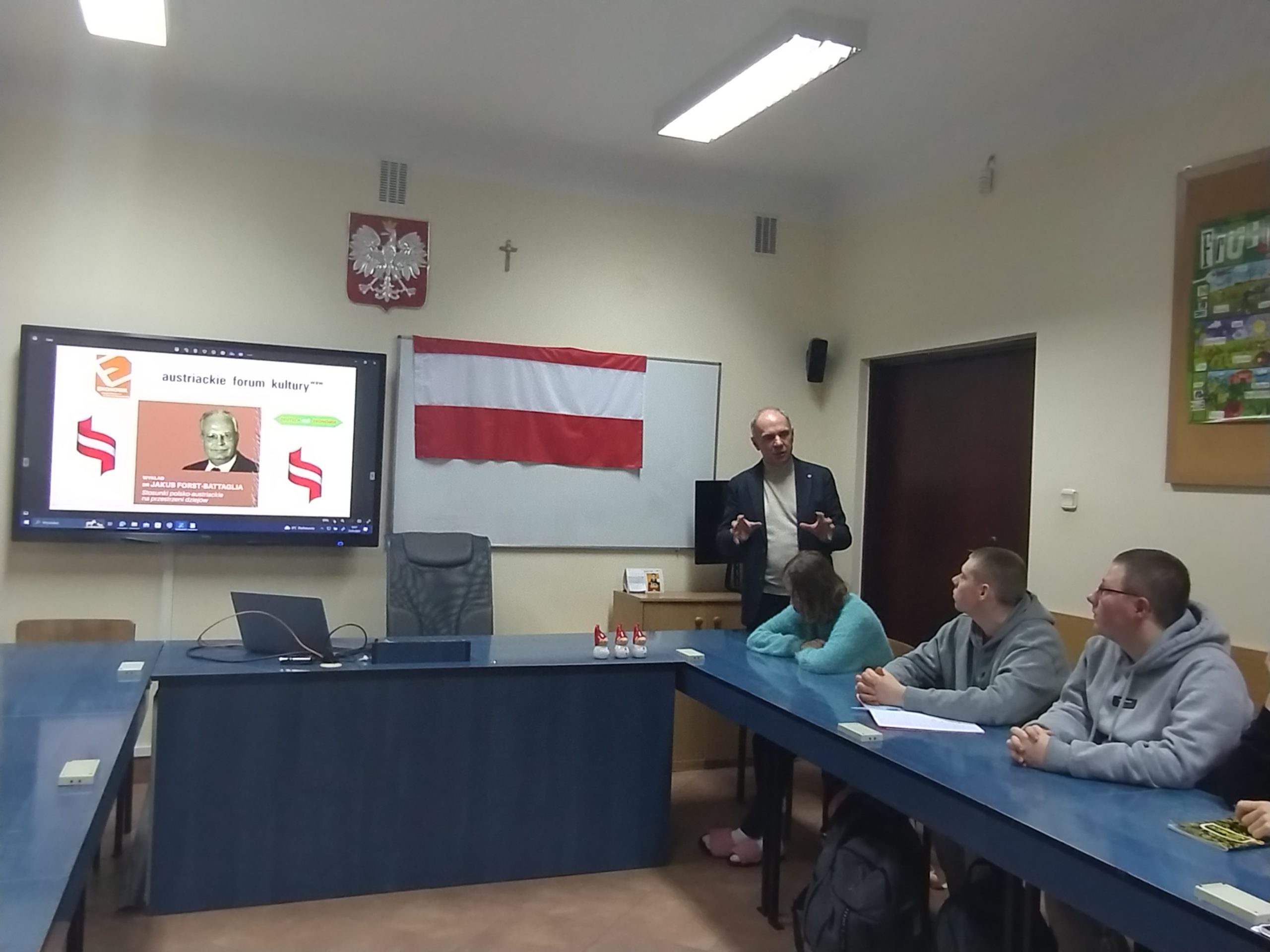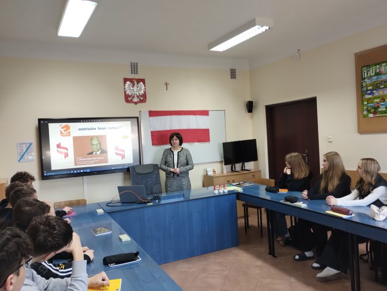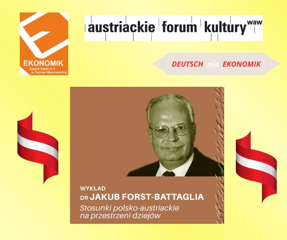 W dniu 29 i 31 stycznia 2024 roku uczniowie klasy II TS i II TI mieli niepowtarzalną okazję wysłuchania retransmisji wykładu dra Jakuba Forsta-Battaglii pt.: „Stosunki polsko-austriackie na przestrzeni dziejów”, którego głównym organizatorem było Austriackie Forum Kultury w Warszawie. W spotkaniu wzięli udział także dyrektor szkoły – pan Bogusław Konrad oraz wicedyrektor szkoły – pani Małgorzata Grzeszczuk.