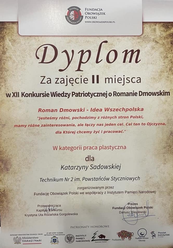 Naszą szkołę w kategorii praca plastyczna reprezentowała Katarzyna Sadowska – uczennica klasy 5TEA, która zajęła ll miejsce.