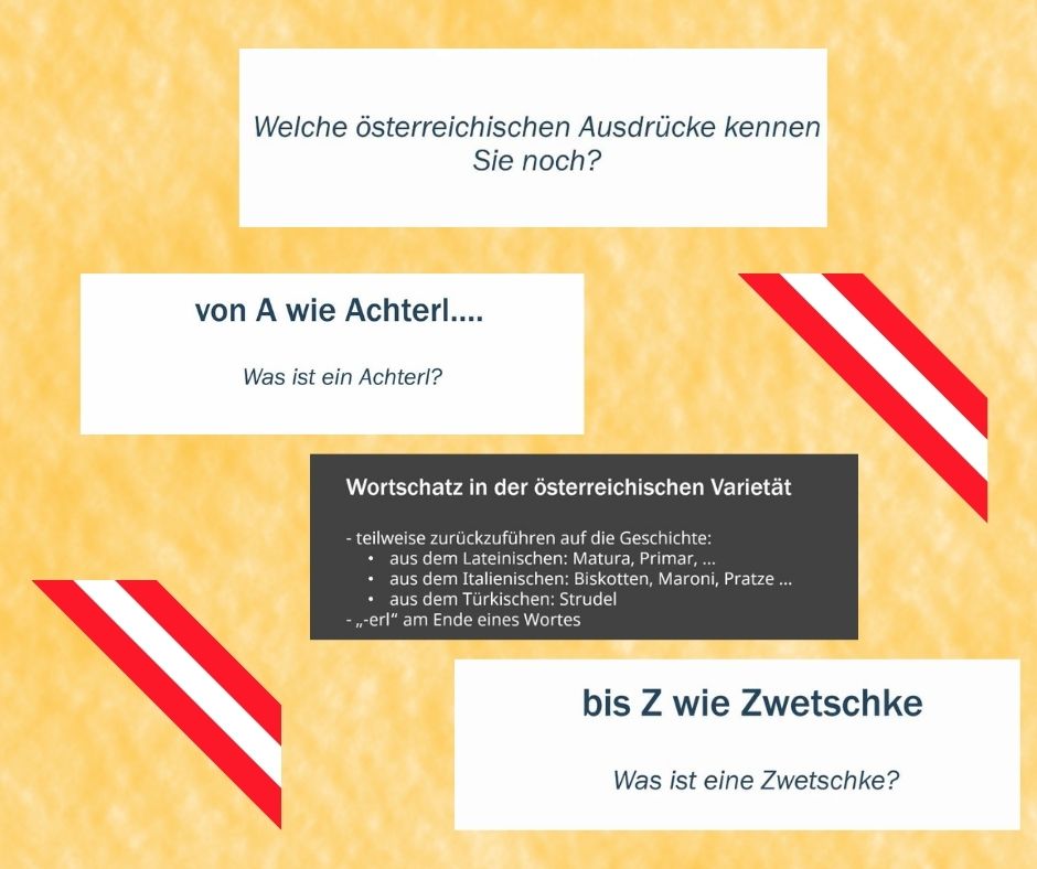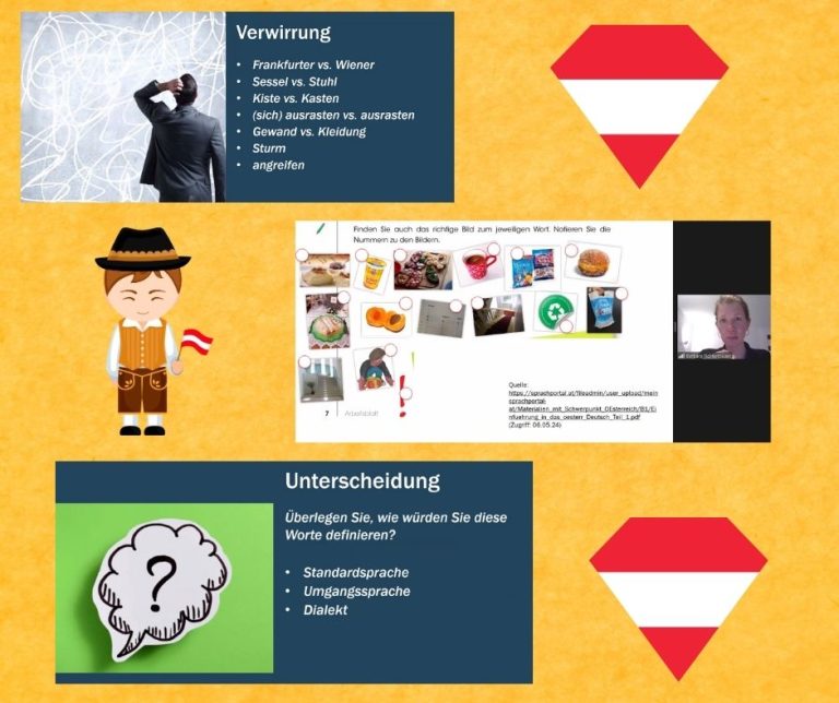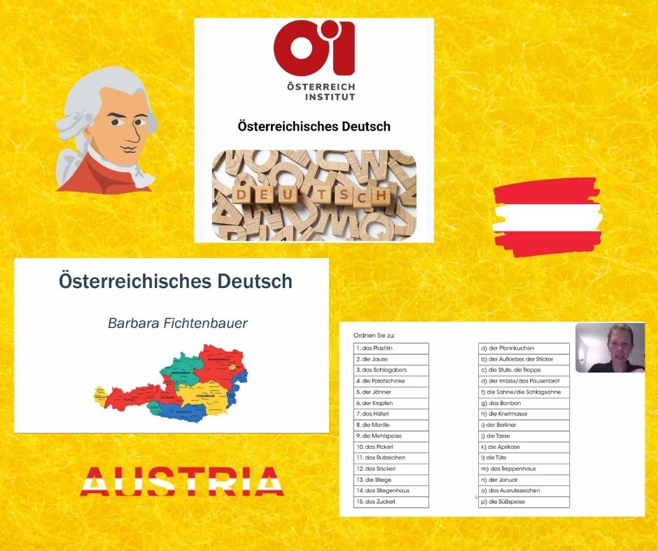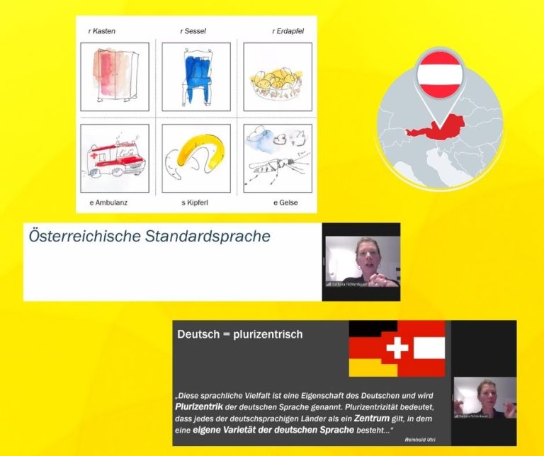 Webinar poprowadziła znana i lubiana pani Barbara Fichtenbauer z Wiednia, która w sposób bardzo ciekawy przedstawiła różnice między standardowym niemieckim (Hochdeutsch), a dialektami austriackimi. Prowadząca odkryła różnice w języku niemieckim używanym w Austrii i innych krajach niemieckojęzycznych, a także pomogła zrozumieć, jak dialekty wpływają na codzienne komunikowanie.