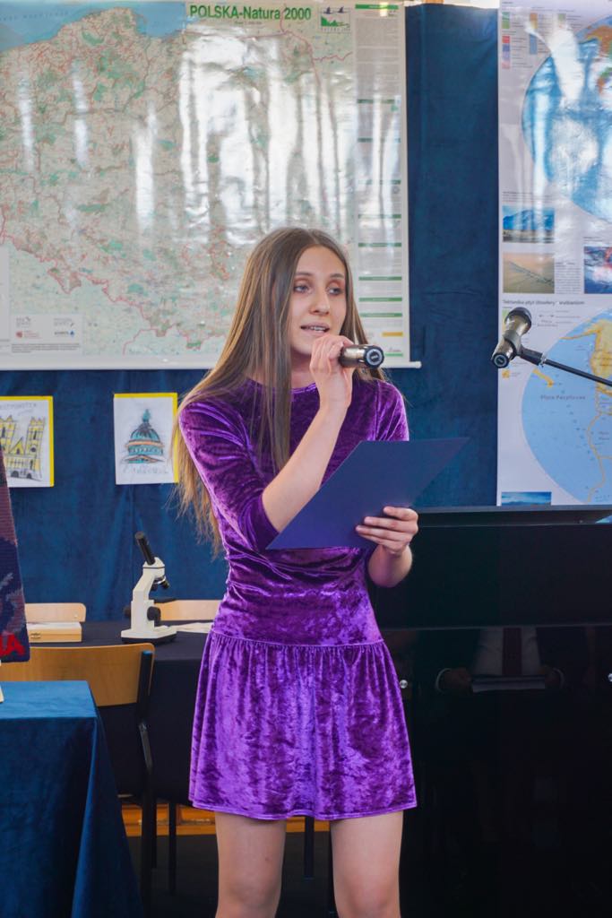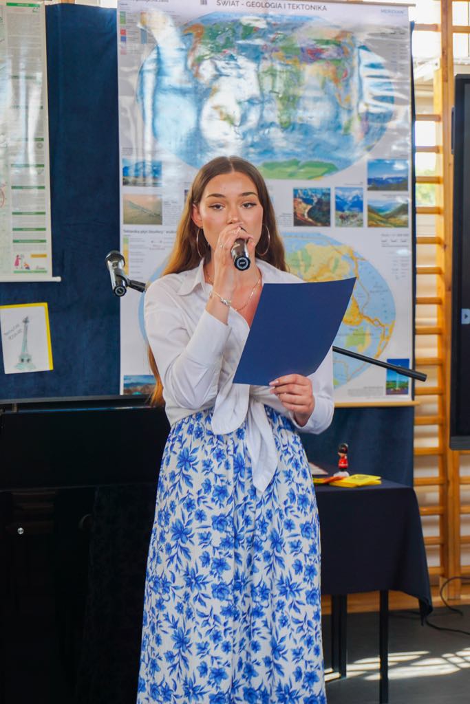 Następnie nauczycielka historii, Urszula Zadroga, wygłosiła referat dotyczący tradycji szkoły związanych z patronem oraz przedstawiła ostatnie osiągnięcia młodzieży w konkursach ogólnopolskich o tematyce historycznej. Jej przemówienie podkreślało znaczenie pamięci historycznej oraz edukacji młodych pokoleń w duchu patriotyzmu i szacunku dla przeszłości.