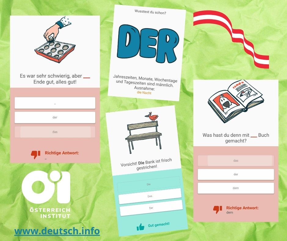Dzięki humorystycznym przykładowym zdaniom i obrazkom udaje się zapamiętać nawet najtrudniejsze słówka. Zdania zaczerpnięte są z codziennego życia i doskonale przygotowują do rzeczywistych sytuacji. Oprócz rodzajnika określonego i nieokreślonego, ćwiczone jest również ich użycie w połączeniu z przyimkami, przymiotnikami i zaimkami dzierżawczymi zarówno w liczbie pojedynczej i mnogiej. Ponadto są tu interesujące informacje o kraju i kulturze, wskazówki gramatyczne i zabawne zwroty. Aplikacja ma również piękny design i zabawną strukturę. Atutem jej jest także dostosowanie do poziomu nauki i zapewnienie regularnych powtórzeń poznanych już słów i zwrotów.