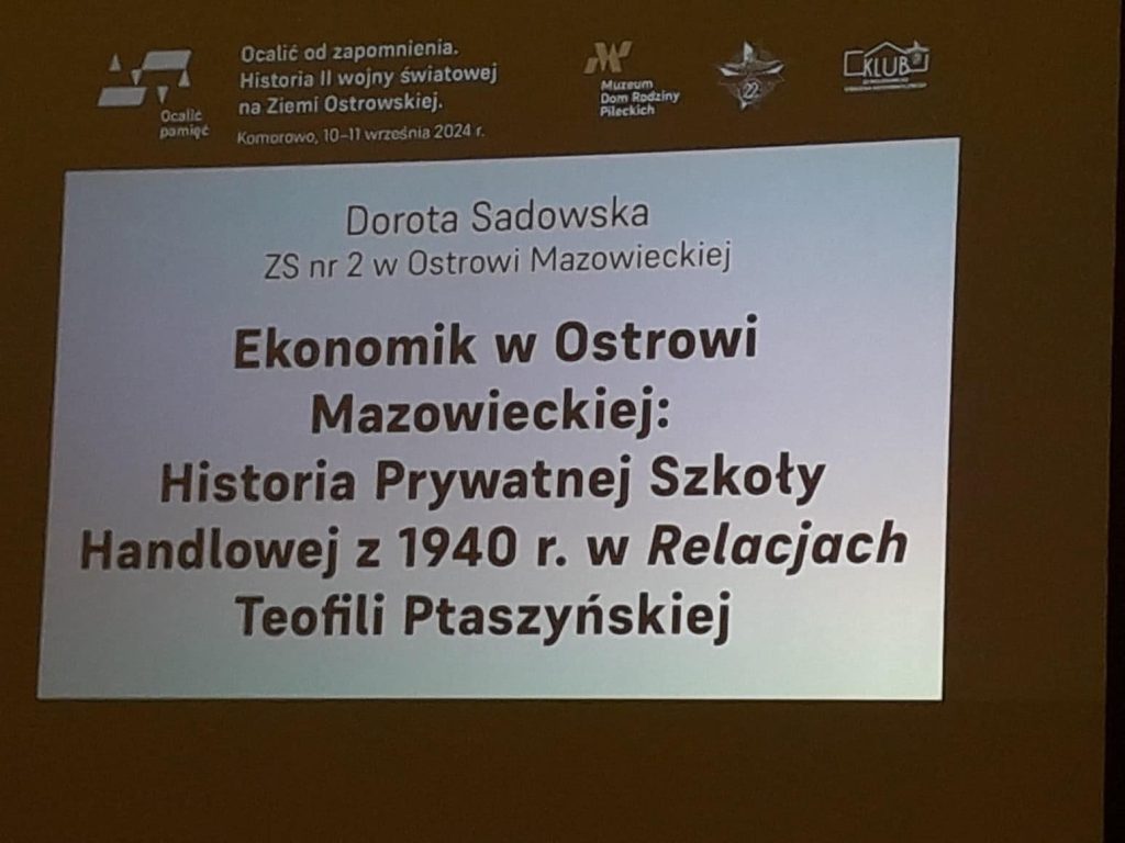 Jedną z prelegentek konferencji była p. Dorota Sadowska, która wygłosiła referat pt. „Ekonomik w Ostrowi Mazowieckiej. Historia Prywatnej Szkoły Handlowej z 1940 roku w relacjach Teofili Ptaszyńskiej”.