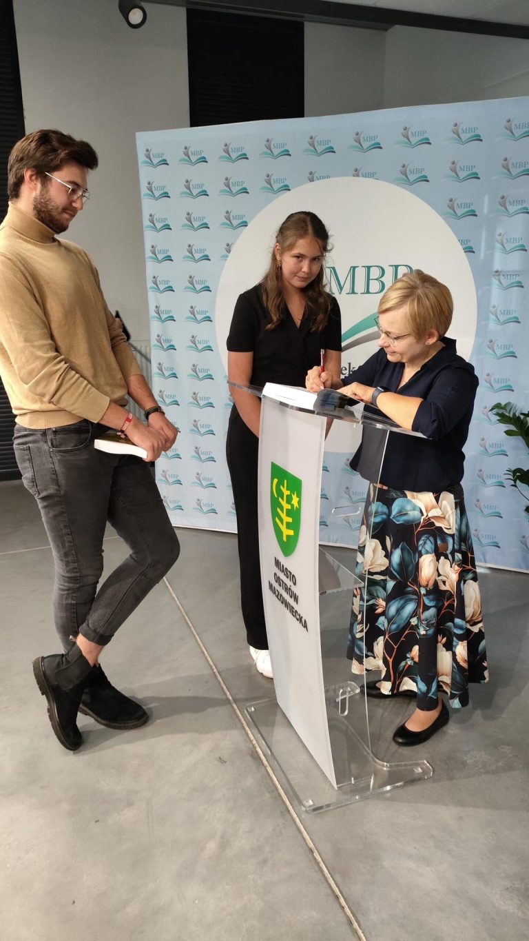 Młodzież z naszej szkoły z panem dyrektorem Bogusławem Konradem i panią Moniką Kucharczyk wzięła udział w spotkaniu promującym książkę „Nazwane, czyli ważne – toponimy, hydronimy i mikrotoponimy powiatu ostrowskiego w ujęciu onomastycznym”. Wydarzenie to było również okazją do podsumowania projektu „Dialog Pokoleń”, który realizowany jest w Ostrowi Mazowieckiej od 2017 roku. Projekt, wspierany przez Towarzystwo Kultury Języka oraz Instytut Języka Polskiego UW, miał na celu zbadanie i dokumentację lokalnego nazewnictwa. Dzięki współpracy wielu instytucji i szkół- w tym i naszego Ekonomika- powstał cenny słownik, który nie tylko chroni dziedzictwo językowe regionu, ale także kultywuje pamięć o lokalnych tradycjach. Znalazły się w nim również prace naszych uczniów Natalii Chodań i Kacpra Słowickiego, z których jesteśmy niezwykle dumni.