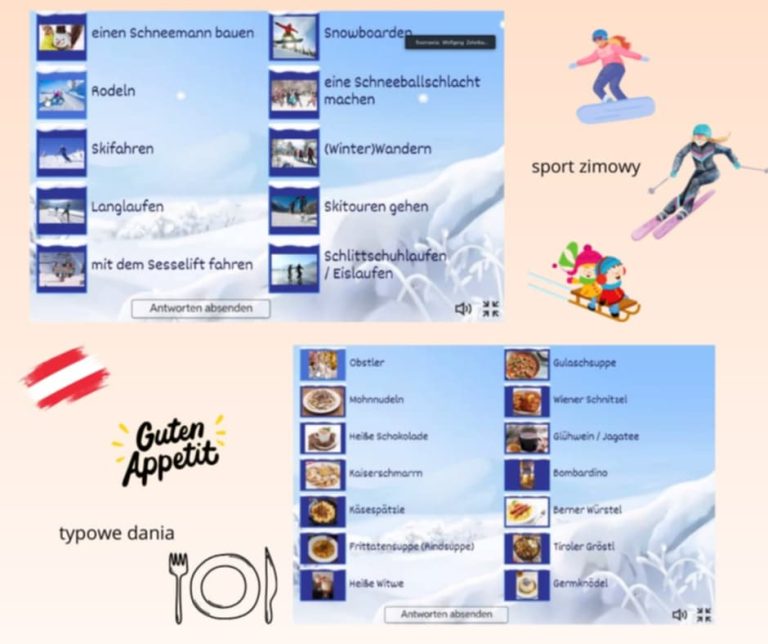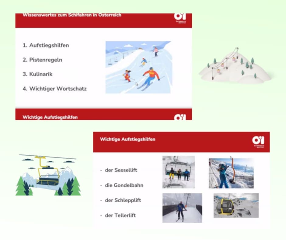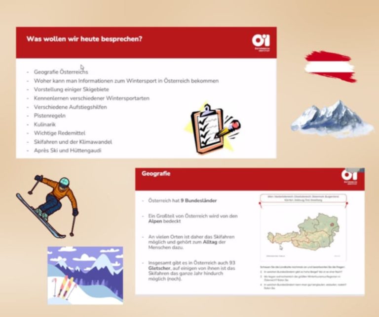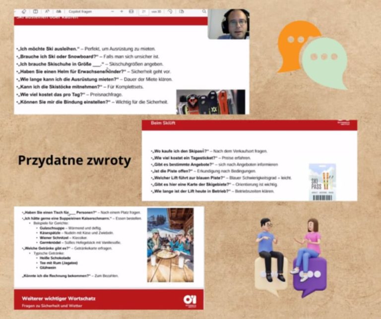 Prowadzący – lektor pan Wolfgang Zehetbauer z Wiednia zapoznał uczestników z typowym słownictwem. Dowiedzieć się można było, jak nazywać sprzęt narciarsko – snowboardowy po niemiecku i typowe potrawy kuchni austriackiej. Była to okazja do zapoznania z zasadami bezpieczeństwa na stoku oraz posłuchania dialektu regionalnego. Do tego zaprezentowane zostały przykładowe dialogi w typowych sytuacjach górskich.