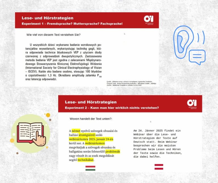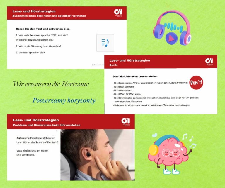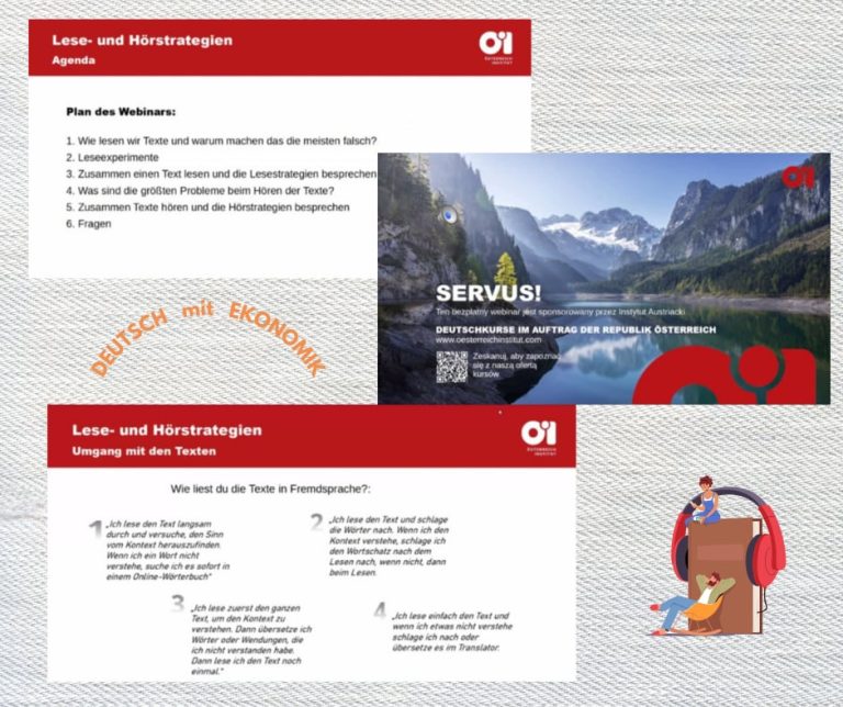 W ramach rozwijania potencjału językowego uczniów oraz otwartości na nowe aktywności edukacyjne grupa uczniów z klasy III TI, II TRH i II TEI razem z panią Agnieszką Waniewską i panią Jagodą Pecko wzięła udział w webinarium online pt.: „LESE- UND HÖRSTRATEGIEN” – „Strategie czytania i słuchania tekstów po niemiecku”. To właśnie czytanie i słuchanie – dwie pasywne umiejętności były tematem webinarium zorganizowanego przez Instytut Austriacki w Krakowie.