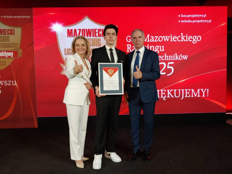Z tej okazji w dniu 7 marca 2025 r. Pan Dyrektor Bogusław Konrad, Pan Krzysztof Wiśniewski oraz reprezentant młodzieży z technikum Wiktor Szczechura uczestniczyli w Uroczystej Gali Finałowej w Warszawie, gdzie z rąk Mazowieckiej Kurator Oświaty Pani Wioletty Krzyżanowskiej odebrali nagrodę.