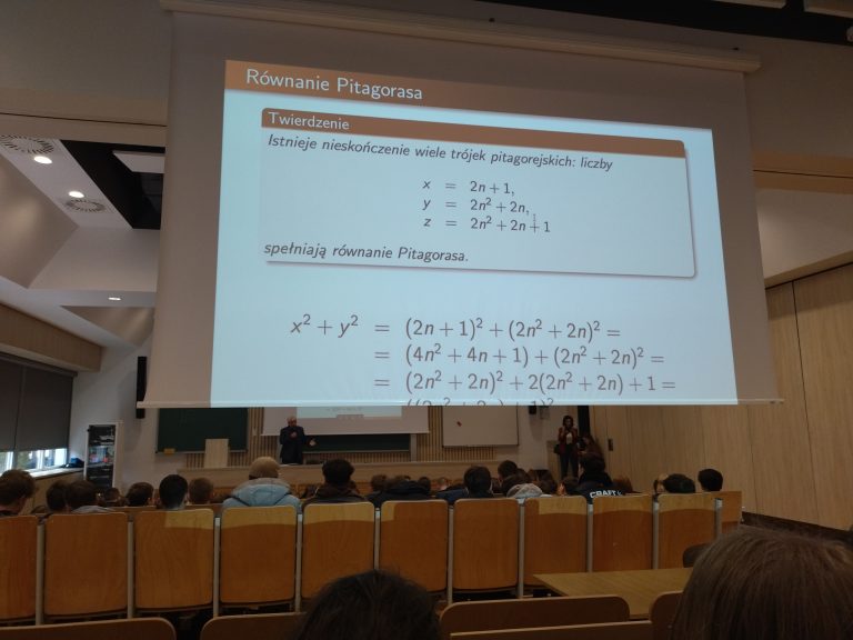 Podsumowaniem pobytu na Politechnice Białostockiej było wysłuchanie wykładu dr hab. Czesława Bagińskiego pt. „o Pitagorasie i jego równaniu”. W swoim wystąpieniu Prelegent przybliżyła m.in. rys historyczny Pitagorasa z Samos, jako tajemniczej postaci. Omówił jak znaleźć rozwiązanie równania Pitagorasa w liczbach całkowitych, tzw. trójki pitagorejskie.