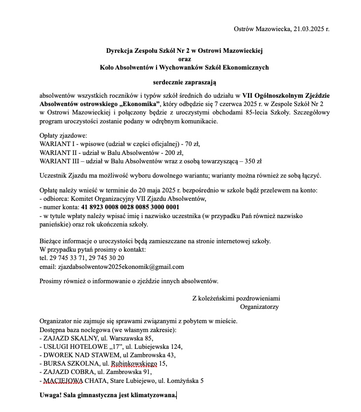 Dyrekcja Zespołu Szkół Nr 2 w Ostrowi Mazowieckiej oraz Koło Absolwentów i Wychowanków Szkół Ekonomicznych serdecznie zapraszają… / Wiadomości ze szkoły / By Dominik Szuliński Koło Absolwentów i Wychowanków Szkół Ekonomicznych w Ostrowi MazowieckiejVII Zjazd Absolwentów Ekonomika